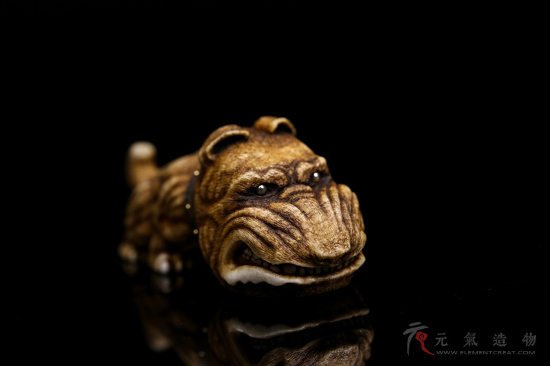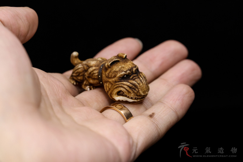 17年底,18年初,全世界的作者都在迎接中国的狗年,制作犬题材根付,乌克兰的西奥多先生选择了斗牛梗这一世界著名的凶恶斗犬为对象制作,在抓住了斗牛梗身体构造的基础上进行了夸张变形,头部长呈卵形,小而有神的铜眼镶嵌,紧合的牙齿,紧凑有力的四肢和略微拱起的后背。