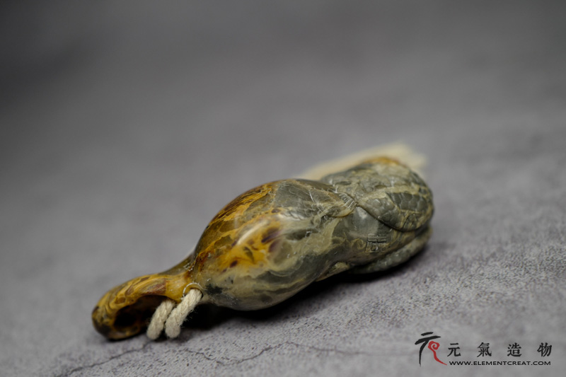 这件选用的材料是昌化石里的五彩冻石,质地细腻颜色丰富,部分红俏色把它用在了头部,有鸿运当头之意,因为材料本身纹理的原因,起初考虑的是参考兰寿金鱼身体做鳞片,但是做好之后效果不尽如人意,纹理颜色过多导致鳞片体现不明显,所以减少了鳞片的分布,增加了高光的部分,处理好后效果不错。