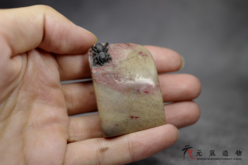 刘关张鸡血石是对红黄白三种颜色鸡血石的一种统称,这块鸡血石顶部有一小块纯纯的黑色肉,当时看到料子就有想好好利用这块黑色部分,原料买过来就是一个随形章,形状没有过多去处理,印面有保留,既可以做章也可以当玩件,黑面积不大能用的题材不多,我决定做一只喜蛛,作为印章立着的时候有喜从天降之意。