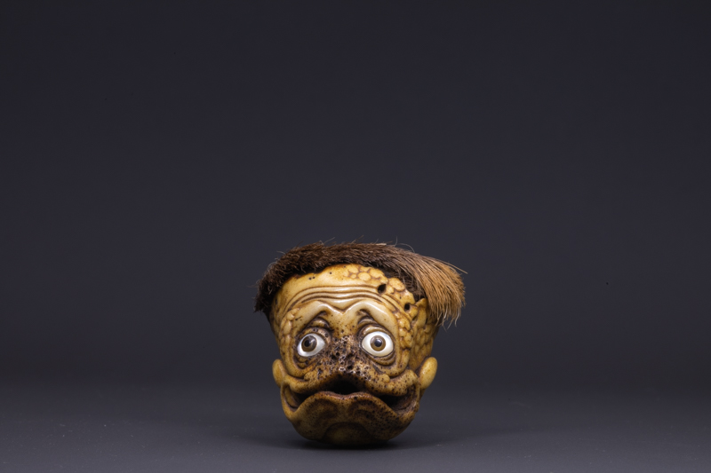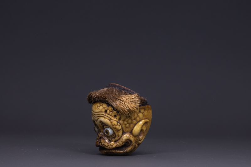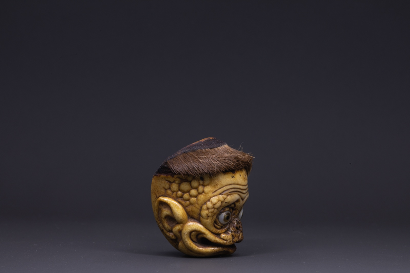 河童是日本民间传说中的传说生物,有鸟的喙、青蛙的四肢、猴子的身体及乌龟的壳,如同多种动物的综合体。传说其弱点为头顶的碟,只要诱骗河童弯身,让他头顶碟子里装的水流尽,他就会精力尽失。在众多题材中,河童是我一向十分青睐的创作题材。就近几年来说,这是我第7次围绕河童题材进行创作了。本次的这个河童使用了带毛发的虾夷鹿角盘,这个料子比较难得是它是实心的并且它算是比较干净,它的密度也不错。这个河童整体的神态是设计得比较生动的—-紧蹙的眉头,瞪圆的双目再搭配他不羁的发型,一个呆萌又带着点叛逆气息的河童便呈现在大家面前了。